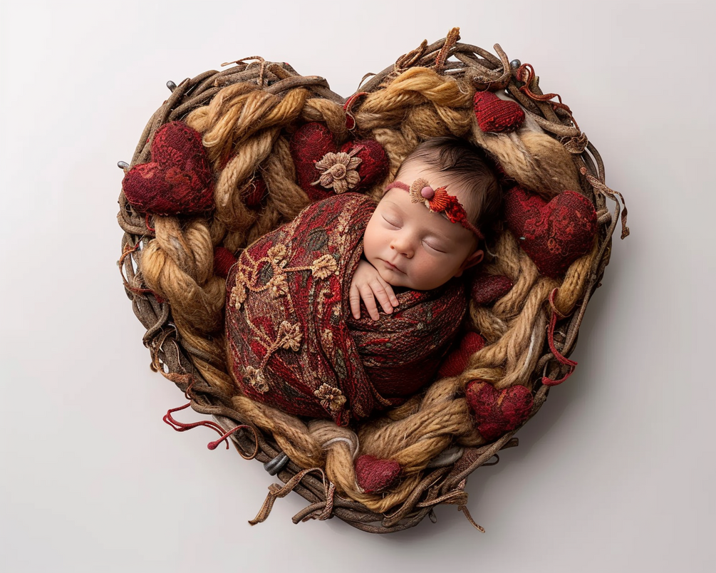Create unforgettable newborn photography with this Valentine's Day-themed digital backdrop! Featuring a heart-shaped nest adorned with cozy woven textures, red lace hearts, and rustic tones, this backdrop is perfect for adding warmth and love to your compositions. Ideal for photographers looking to elevate their Valentine's or holiday-themed sessions with a romantic and elegant touch.
